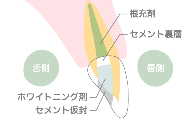このような場合、歯の内側に薬剤を置いて、内側から白くしていくことができます。これがウォーキングブリーチと呼ばれる方法です。